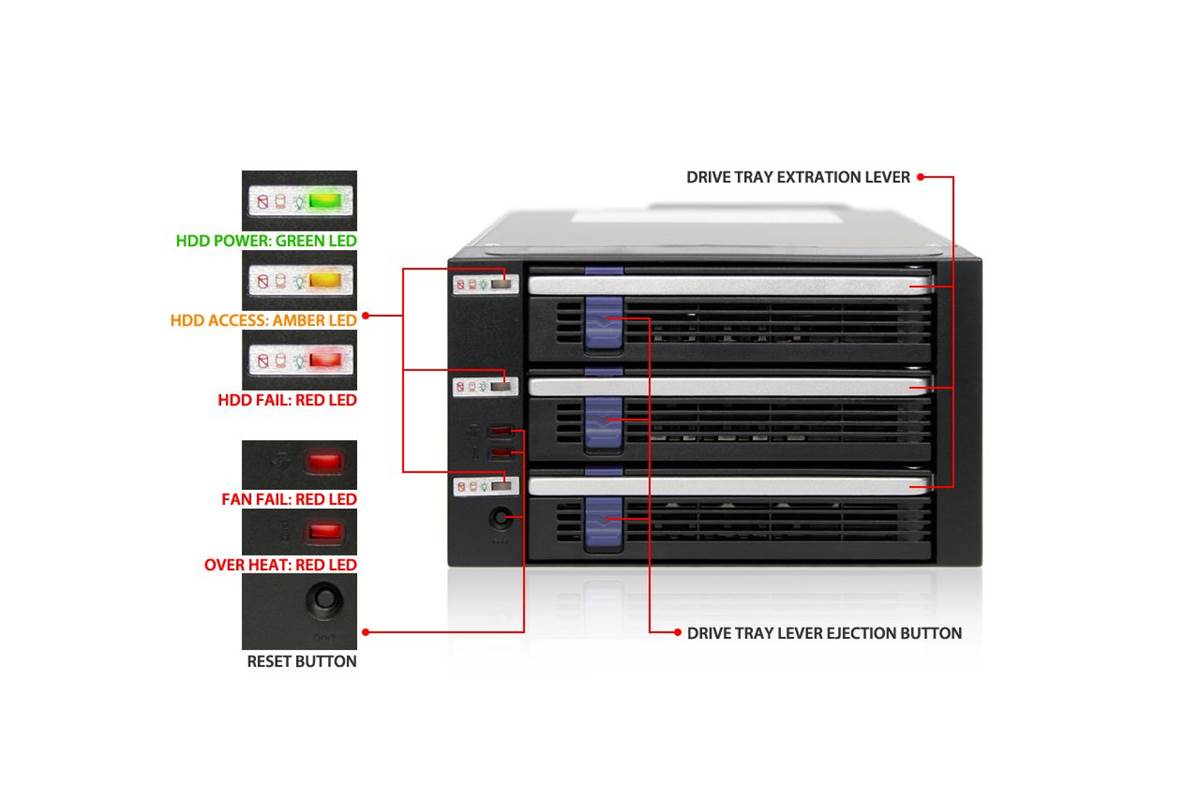 * Convient à trois disques durs 2.5"/3.5" SATA I/II/III (SATA 6Gbps) dans seulement 2 baies de 5.25" et supporte la fonction Hot-Swap.