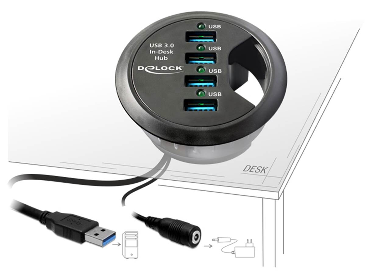 Ce Hub peut être installé dans une fente existante de votre bureau et vous permet de faire passer les câbles pour le moniteur, le clavier et la souris. C'est une solution pratique et peu encombrante qui vous permet de connecter facilement vos périphériques USB.